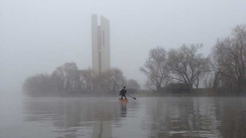 Mystery surrounds a man dressed as an undertaker in a coffin who has been spotted gliding through the morning mist on Lake Burley Griffin in Canberra, Australia.